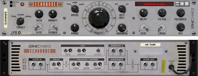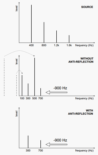 Echobode features a unique "anti-reflection" stage that removes "negative" frequencies (frequencies that are shifted down beyond 0 Hz and would otherwise bounce back into the audible spectrum). This stage also eliminates frequencies that are shifted up over half the sample-rate ("nyquist").