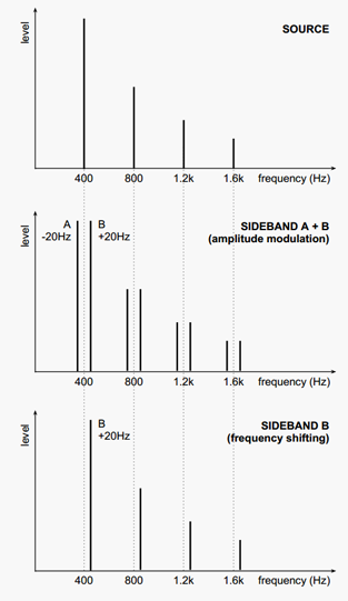 When a frequency shifter processes audio, two "sidebands" are generated, one that is shifted upwards and one that is shifted downwards. The challenge in creating a good frequency shifter lies in suppressing one of these sidebands (otherwise the effect sounds like a regular amplitude modulator). We are proud to say that Echobode features excellent suppression over the range of 40 Hz to 20 kHz. If you want less suppression there is a "sideband mix" parameter that you can adjust, allowing you to create amplitude and ring modulation effects.